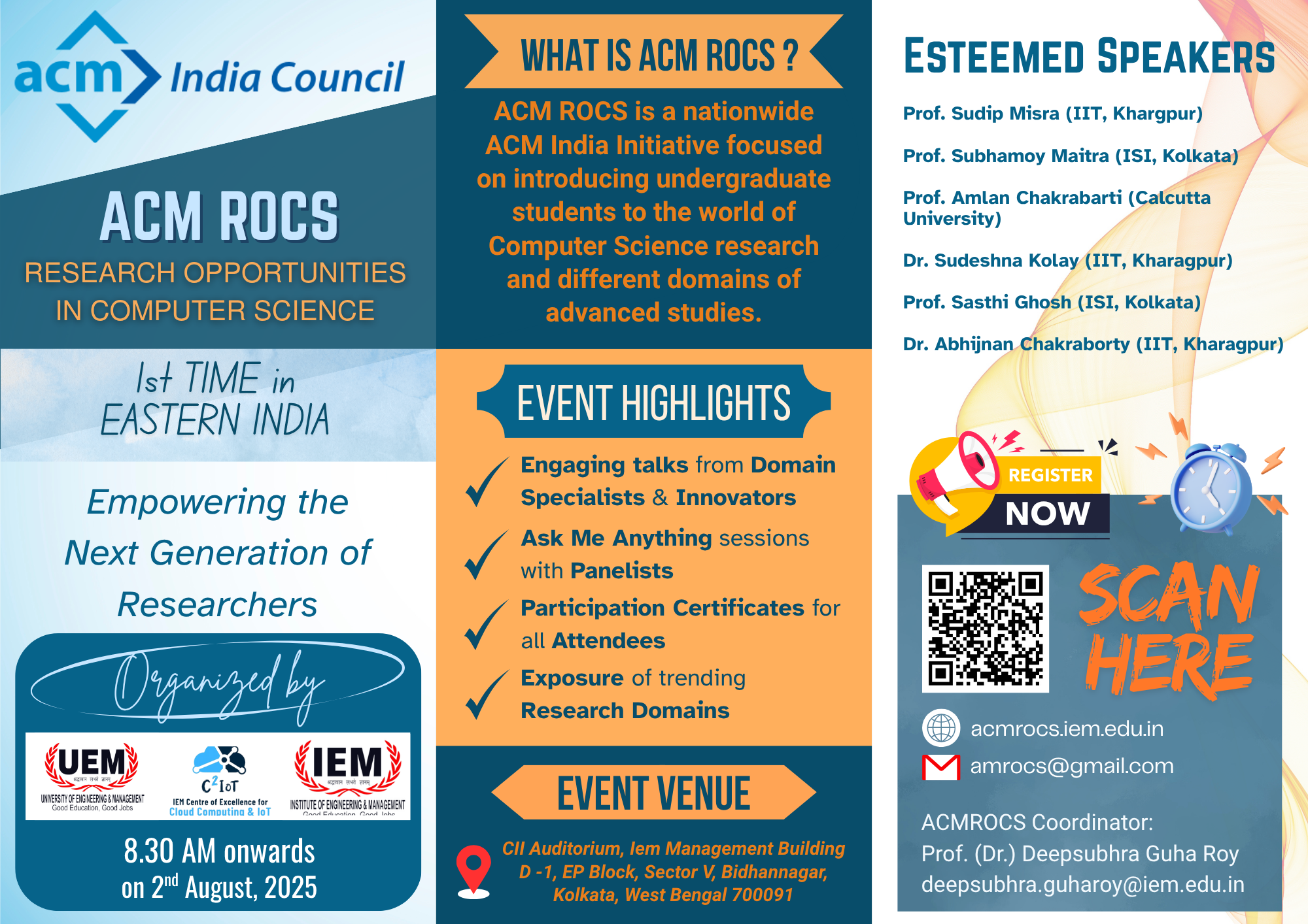 The Institute of Engineering & Management (IEM), Kolkata, in collaboration with ACM India, proudly hosted the inaugural Research Opportunities in Computer Science (ROCS) 2025 workshop on August 2, 2025, at the IEM Management House, Salt Lake, Kolkata. This landmark event marked the first-ever ACM ROCS in Eastern India, representing a significant step toward fostering a research-driven academic culture in the region. With over 200 registrations from more than 30 colleges, alongside distinguished faculty and researchers, the workshop served as a catalyst for inspiring young technologists to explore cutting-edge advancements in Computer Science and their real-world applications.